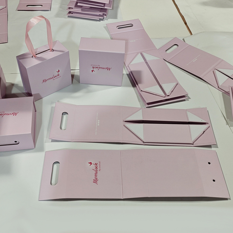 Hộp quà cao cấp bằng bìa cứng nhỏ, cứng cáp, có tay cầm bằng ruy băng, đóng mở bằng nam châm, in nổi, phổ biến cho đồ trang sức